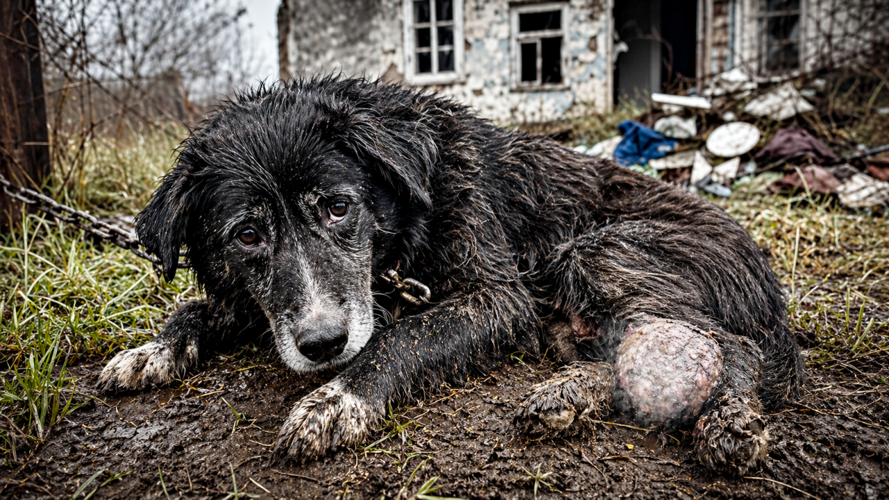 その命の主は、一匹の老犬。名を「ジャクソン」と呼ばれる彼は、過酷な運命に苦しんでいました。雨が降りしきる中、庭の片隅で泥にまみれた体を震わせていたジャクソン。首に巻かれた短い鎖が、彼の世界をわずか数メートルに制限していました。右足には腫瘍が重くのしかかり、歩くことさえ困難にしていました。それでも、彼は動こうとはしませんでした。何故なら、彼が知る唯一の「家」はこの場所であり、いつか飼い主が戻ってくることを信じていたからです。